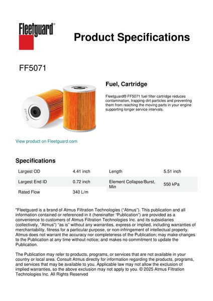 Fleetguard® FF5071 fuel filter cartridge reduces contamination, trapping dirt particles and preventing them from reaching the moving parts in your engine supporting longer service intervals.Specification
