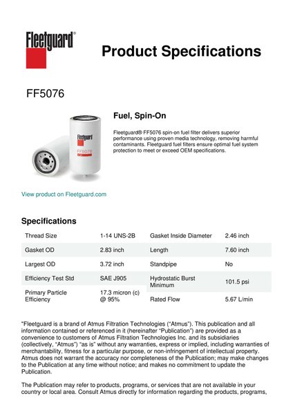 Fleetguard® FF5076 spin-on fuel filter delivers superior performance using proven media technology, removing harmful contaminants. Fleetguard fuel filters ensure optimal fuel system protection to meet or exceed OEM specifications.Specification