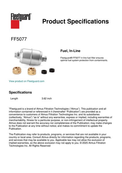 Fleetguard® FF5077 in-line fuel filter ensures optimal fuel system protection from contaminants.Specification
