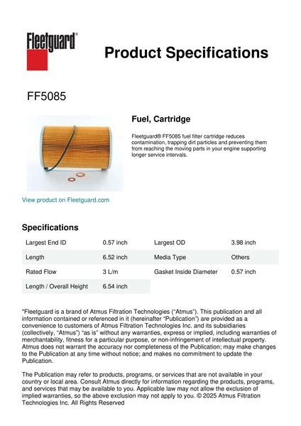 Fleetguard® FF5085 fuel filter cartridge reduces contamination, trapping dirt particles and preventing them from reaching the moving parts in your engine supporting longer service intervals.Specification
