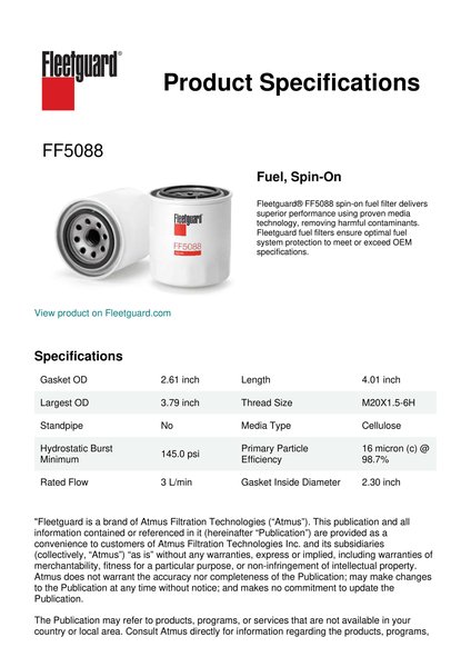 Fleetguard® FF5088 spin-on fuel filter delivers superior performance using proven media technology, removing harmful contaminants. Fleetguard fuel filters ensure optimal fuel system protection to meet or exceed OEM specifications.Specification