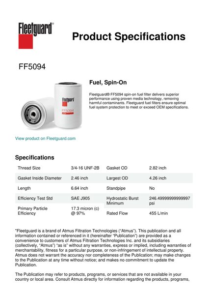 Fleetguard® FF5094 spin-on fuel filter delivers superior performance using proven media technology, removing harmful contaminants. Fleetguard fuel filters ensure optimal fuel system protection to meet or exceed OEM specifications.Specification