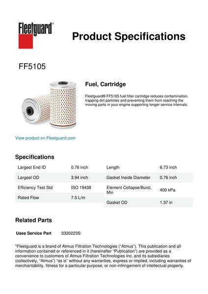 Fleetguard® FF5105 fuel filter cartridge reduces contamination, trapping dirt particles and preventing them from reaching the moving parts in your engine supporting longer service intervals.Specification