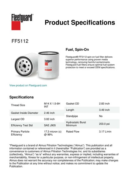 Fleetguard® FF5112 spin-on fuel filter delivers superior performance using proven media technology, removing harmful contaminants. Fleetguard fuel filters ensure optimal fuel system protection to meet or exceed OEM specifications.Specification