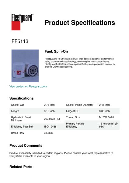 Fleetguard® FF5113 spin-on fuel filter delivers superior performance using proven media technology, removing harmful contaminants. Fleetguard fuel filters ensure optimal fuel system protection to meet or exceed OEM specifications.Specification