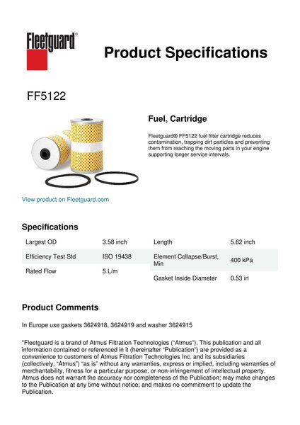 Fleetguard® FF5122 fuel filter cartridge reduces contamination, trapping dirt particles and preventing them from reaching the moving parts in your engine supporting longer service intervals.Specification