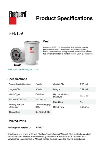 Fleetguard® FF5159 spin-on fuel filter delivers superior performance using proven media technology, removing harmful contaminants. Fleetguard fuel filters ensure optimal fuel system protection to meet or exceed OEM specifications.Specification