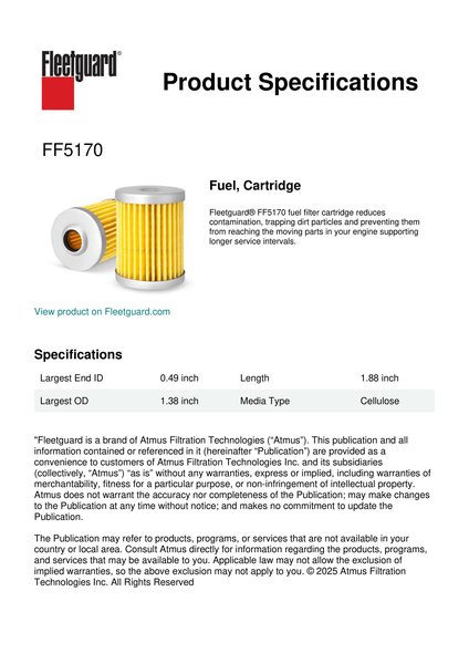 Fleetguard® FF5170 fuel filter cartridge reduces contamination, trapping dirt particles and preventing them from reaching the moving parts in your engine supporting longer service intervals.Specification