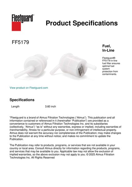 Fleetguard® FF5179 in-line fuel filter ensures optimal fuel system protection from contaminants.Specification