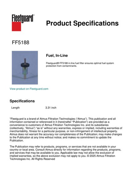 Fleetguard® FF5188 in-line fuel filter ensures optimal fuel system protection from contaminants.Specification