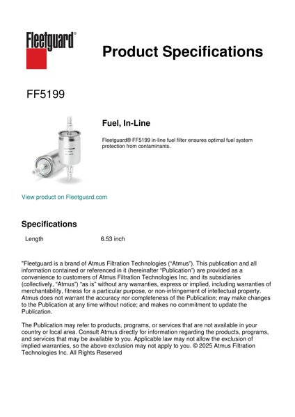 Fleetguard® FF5199 in-line fuel filter ensures optimal fuel system protection from contaminants.Specification