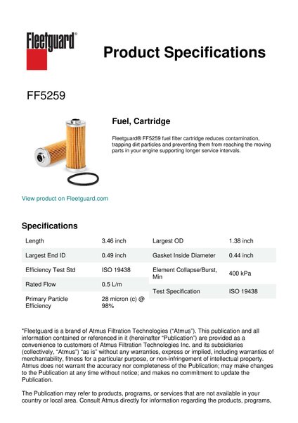 Fleetguard® FF5259 fuel filter cartridge reduces contamination, trapping dirt particles and preventing them from reaching the moving parts in your engine supporting longer service intervals.Specification