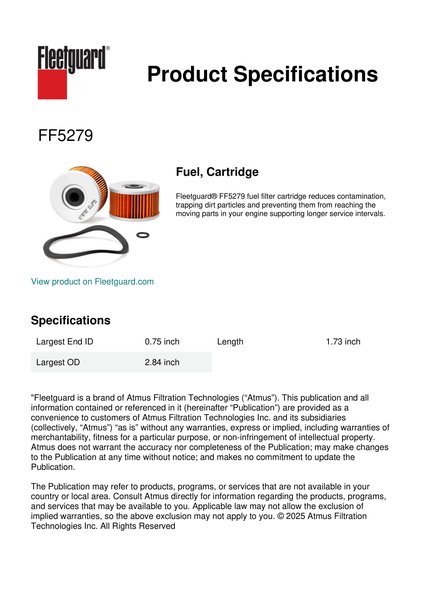 Fleetguard® FF5279 fuel filter cartridge reduces contamination, trapping dirt particles and preventing them from reaching the moving parts in your engine supporting longer service intervals.Specification