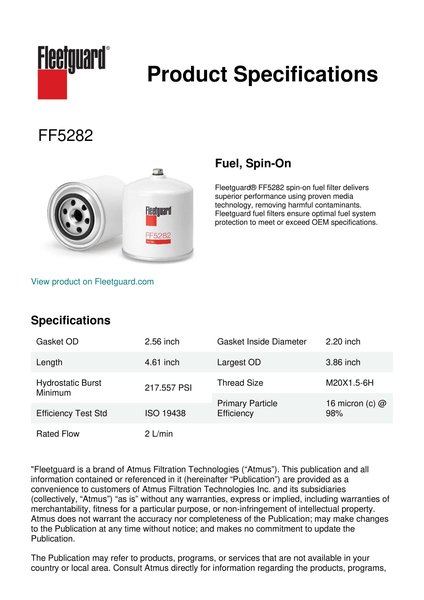 Fleetguard® FF5282 spin-on fuel filter delivers superior performance using proven media technology, removing harmful contaminants. Fleetguard fuel filters ensure optimal fuel system protection to meet or exceed OEM specifications.Specification