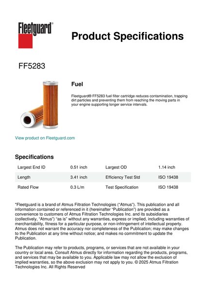 Fleetguard® FF5283 fuel filter cartridge reduces contamination, trapping dirt particles and preventing them from reaching the moving parts in your engine supporting longer service intervals.Specification