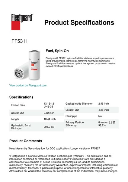 Fleetguard® FF5311 spin-on fuel filter delivers superior performance using proven media technology, removing harmful contaminants. Fleetguard fuel filters ensure optimal fuel system protection to meet or exceed OEM specifications.Specification