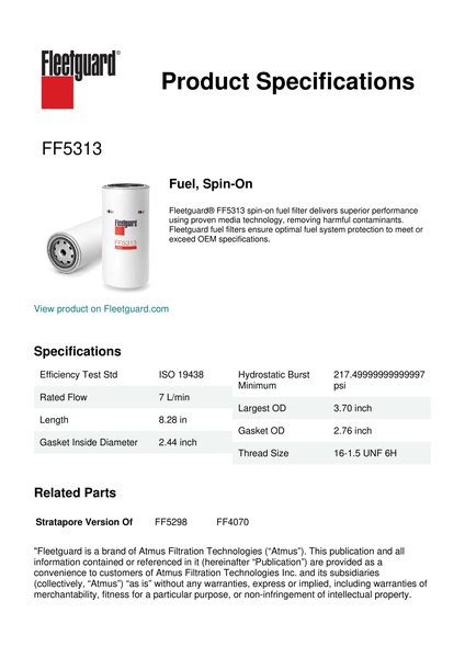 Fleetguard® FF5313 spin-on fuel filter delivers superior performance using proven media technology, removing harmful contaminants. Fleetguard fuel filters ensure optimal fuel system protection to meet or exceed OEM specifications.Specification