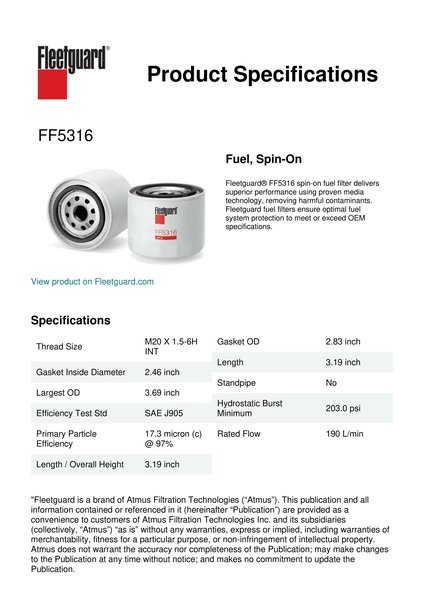 Fleetguard® FF5316 spin-on fuel filter delivers superior performance using proven media technology, removing harmful contaminants. Fleetguard fuel filters ensure optimal fuel system protection to meet or exceed OEM specifications.Specification