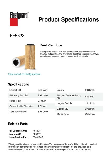 Fleetguard® FF5323 fuel filter cartridge reduces contamination, trapping dirt particles and preventing them from reaching the moving parts in your engine supporting longer service intervals.Specification