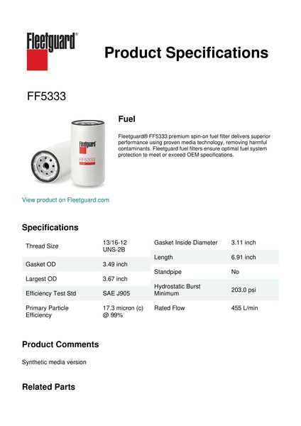 Fleetguard® FF5333 premium spin-on fuel filter delivers superior performance using proven media technology, removing harmful contaminants. Fleetguard fuel filters ensure optimal fuel system protection to meet or exceed OEM specifications.Specification