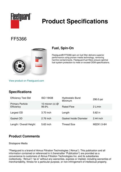Fleetguard® FF5366 spin-on fuel filter delivers superior performance using proven media technology, removing harmful contaminants. Fleetguard fuel filters ensure optimal fuel system protection to meet or exceed OEM specifications.Specification