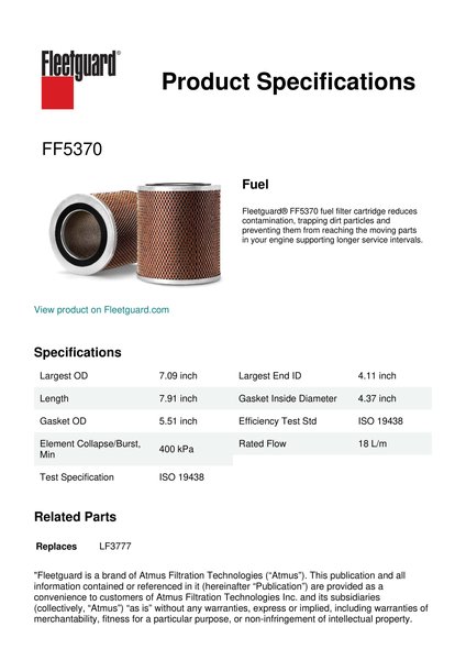 Fleetguard® FF5370 fuel filter cartridge reduces contamination, trapping dirt particles and preventing them from reaching the moving parts in your engine supporting longer service intervals.Specification