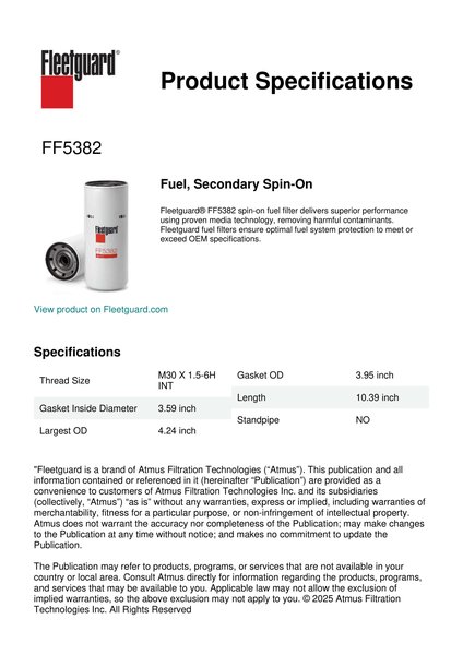 Fleetguard® FF5382 spin-on fuel filter delivers superior performance using proven media technology, removing harmful contaminants. Fleetguard fuel filters ensure optimal fuel system protection to meet or exceed OEM specifications.Specification