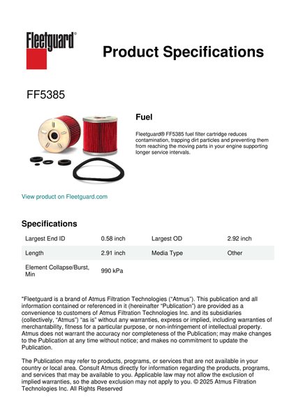Fleetguard® FF5385 fuel filter cartridge reduces contamination, trapping dirt particles and preventing them from reaching the moving parts in your engine supporting longer service intervals.Specification