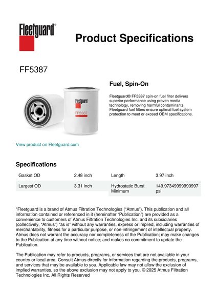 Fleetguard® FF5387 spin-on fuel filter delivers superior performance using proven media technology, removing harmful contaminants. Fleetguard fuel filters ensure optimal fuel system protection to meet or exceed OEM specifications.Specification