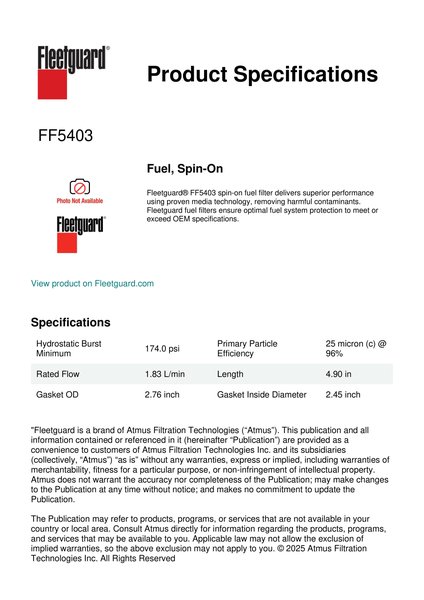 Fleetguard® FF5403 spin-on fuel filter delivers superior performance using proven media technology, removing harmful contaminants. Fleetguard fuel filters ensure optimal fuel system protection to meet or exceed OEM specifications.Specification