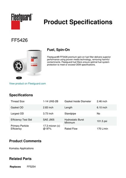 Fleetguard® FF5426 premium spin-on fuel filter delivers superior performance using proven media technology, removing harmful contaminants. Fleetguard fuel filters ensure optimal fuel system protection to meet or exceed OEM specifications.Specification