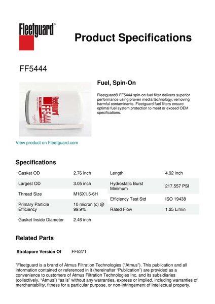 Fleetguard® FF5444 spin-on fuel filter delivers superior performance using proven media technology, removing harmful contaminants. Fleetguard fuel filters ensure optimal fuel system protection to meet or exceed OEM specifications.Specification