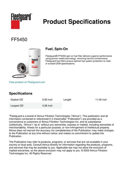 Fleetguard® FF5450 spin-on fuel filter delivers superior performance using proven media technology, removing harmful contaminants. Fleetguard fuel filters ensure optimal fuel system protection to meet or exceed OEM specifications.Specification