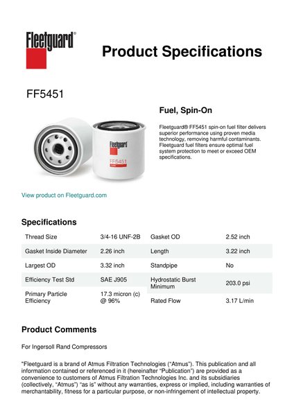 Fleetguard® FF5451 spin-on fuel filter delivers superior performance using proven media technology, removing harmful contaminants. Fleetguard fuel filters ensure optimal fuel system protection to meet or exceed OEM specifications.Specification