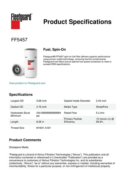 Fleetguard® FF5457 spin-on fuel filter delivers superior performance using proven media technology, removing harmful contaminants. Fleetguard fuel filters ensure optimal fuel system protection to meet or exceed OEM specifications.Specification