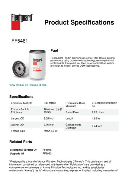 Fleetguard® FF5461 premium spin-on fuel filter delivers superior performance using proven media technology, removing harmful contaminants. Fleetguard fuel filters ensure optimal fuel system protection to meet or exceed OEM specifications.Specification
