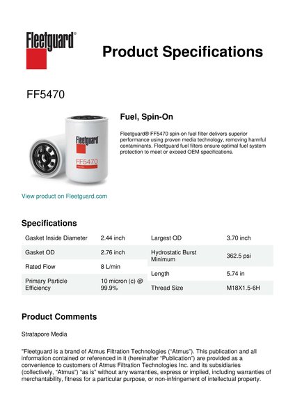 Fleetguard® FF5470 spin-on fuel filter delivers superior performance using proven media technology, removing harmful contaminants. Fleetguard fuel filters ensure optimal fuel system protection to meet or exceed OEM specifications.Specification
