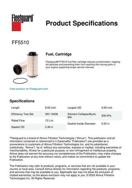 Fleetguard® FF5510 fuel filter cartridge reduces contamination, trapping dirt particles and preventing them from reaching the moving parts in your engine supporting longer service intervals.Specification
