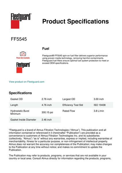 Fleetguard® FF5545 spin-on fuel filter delivers superior performance using proven media technology, removing harmful contaminants. Fleetguard fuel filters ensure optimal fuel system protection to meet or exceed OEM specifications.Specification