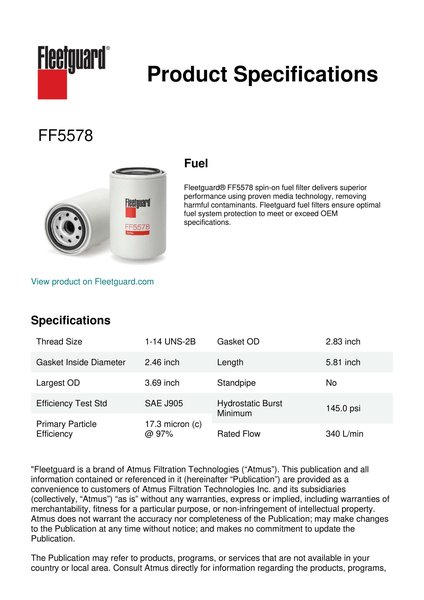 Fleetguard® FF5578 spin-on fuel filter delivers superior performance using proven media technology, removing harmful contaminants. Fleetguard fuel filters ensure optimal fuel system protection to meet or exceed OEM specifications.Specification
