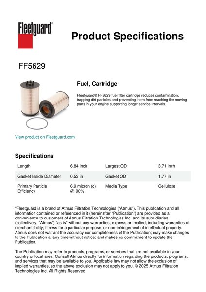 Fleetguard® FF5629 fuel filter cartridge reduces contamination, trapping dirt particles and preventing them from reaching the moving parts in your engine supporting longer service intervals.Specification