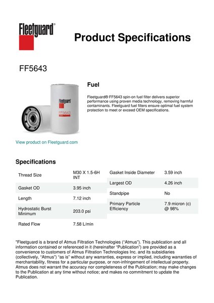 Fleetguard® FF5643 spin-on fuel filter delivers superior performance using proven media technology, removing harmful contaminants. Fleetguard fuel filters ensure optimal fuel system protection to meet or exceed OEM specifications.Specification