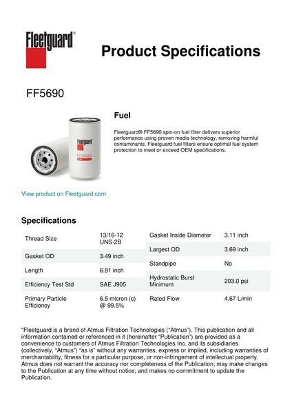 Fleetguard® FF5690 spin-on fuel filter delivers superior performance using proven media technology, removing harmful contaminants. Fleetguard fuel filters ensure optimal fuel system protection to meet or exceed OEM specifications.Specification