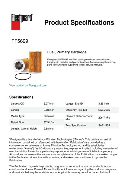 Fleetguard® FF5699 fuel filter cartridge reduces contamination, trapping dirt particles and preventing them from reaching the moving parts in your engine supporting longer service intervals.Specification