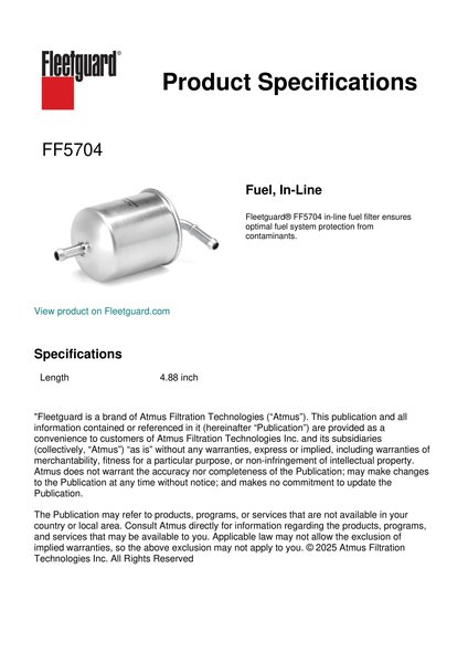 Fleetguard® FF5704 in-line fuel filter ensures optimal fuel system protection from contaminants.Specification