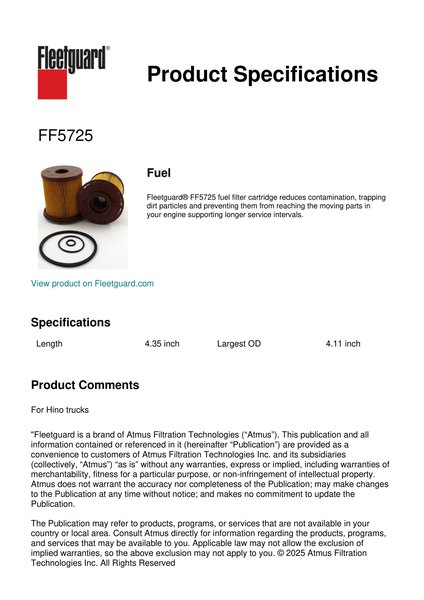 Fleetguard® FF5725 fuel filter cartridge reduces contamination, trapping dirt particles and preventing them from reaching the moving parts in your engine supporting longer service intervals.Specification