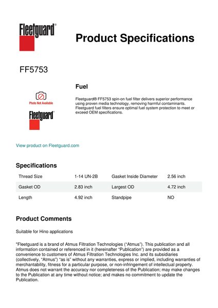 Fleetguard® FF5753 spin-on fuel filter delivers superior performance using proven media technology, removing harmful contaminants. Fleetguard fuel filters ensure optimal fuel system protection to meet or exceed OEM specifications.Specification