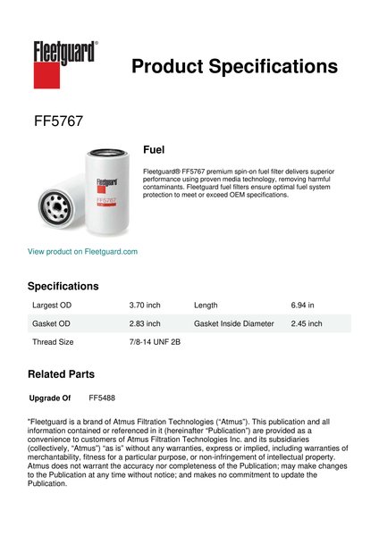 Fleetguard® FF5767 premium spin-on fuel filter delivers superior performance using proven media technology, removing harmful contaminants. Fleetguard fuel filters ensure optimal fuel system protection to meet or exceed OEM specifications.Specification