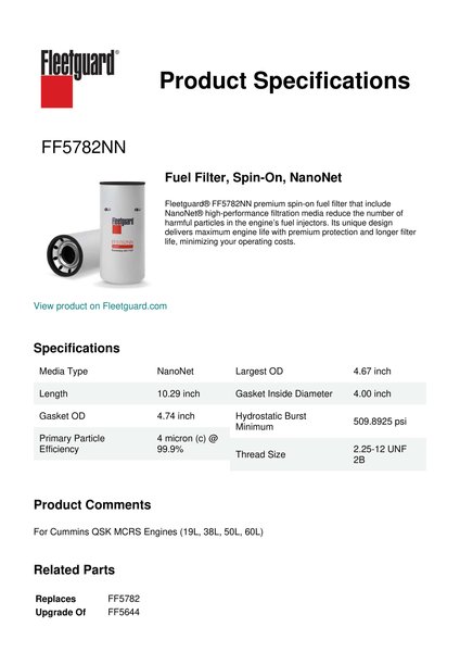 Fleetguard® FF5782NN premium spin-on fuel filter that include NanoNet® high-performance filtration media reduce the number of harmful particles in the engine’s fuel injectors. Its unique design delivers maximum engine life with premium protection and longer filter life, minimizing your operating costs.Specification
