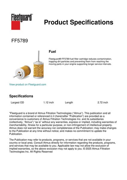 Fleetguard® FF5789 fuel filter cartridge reduces contamination, trapping dirt particles and preventing them from reaching the moving parts in your engine supporting longer service intervals.Specification